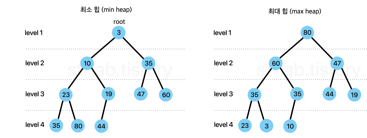 - 최소 힙 : 부모노드의 키값이 자식노드의 키값보다 항상 작은 힙